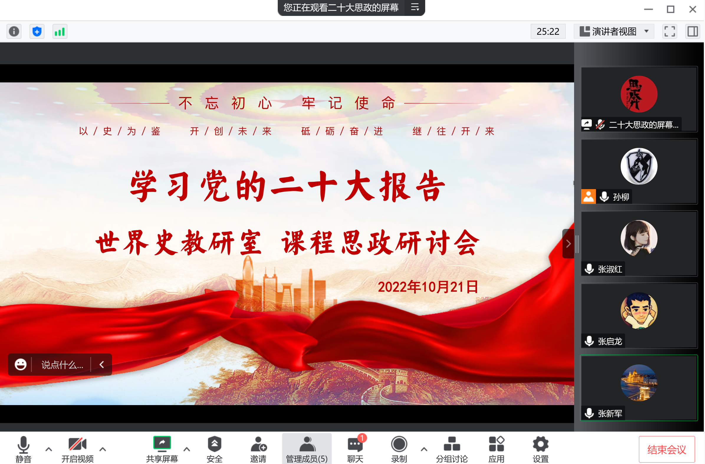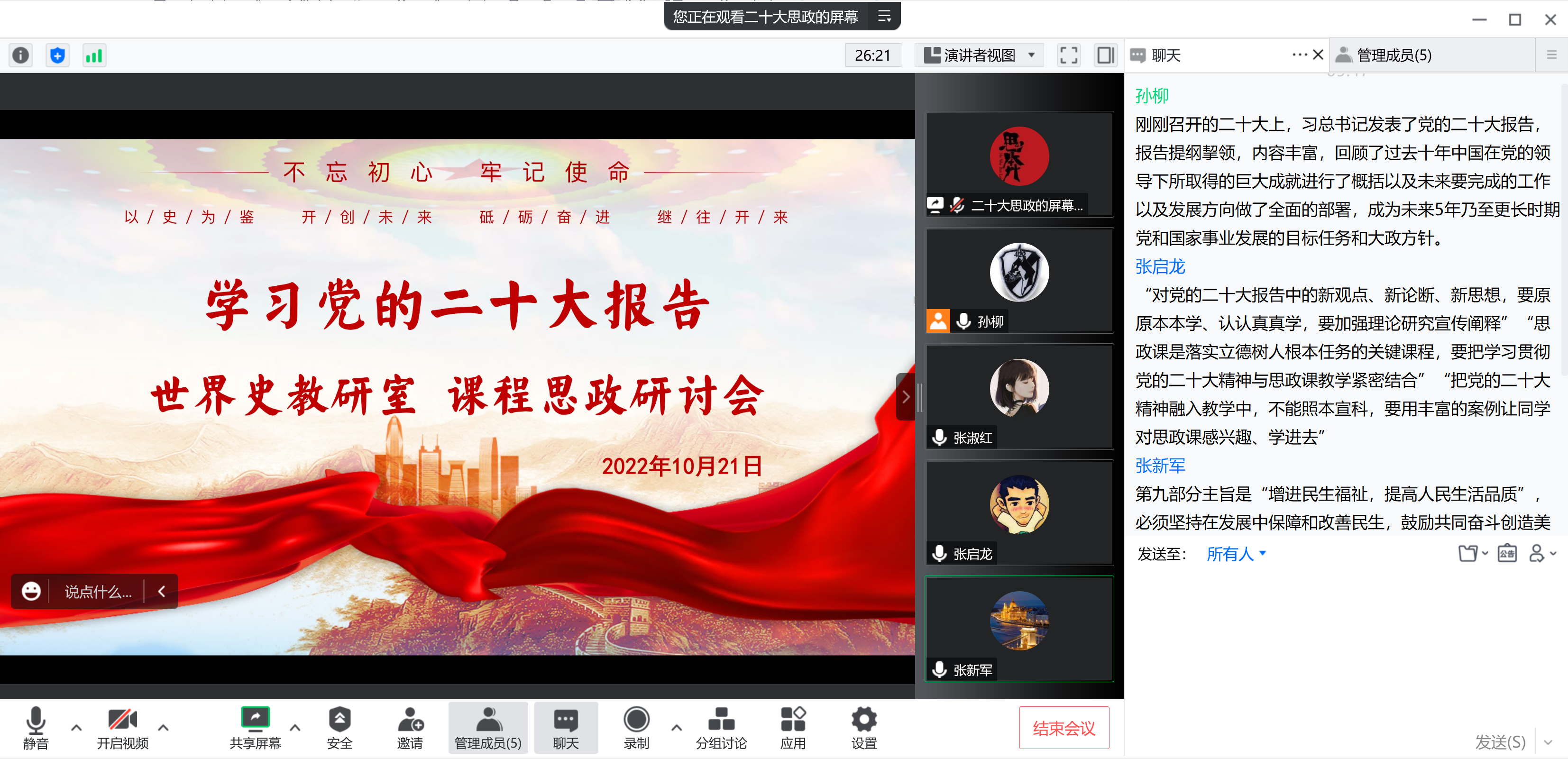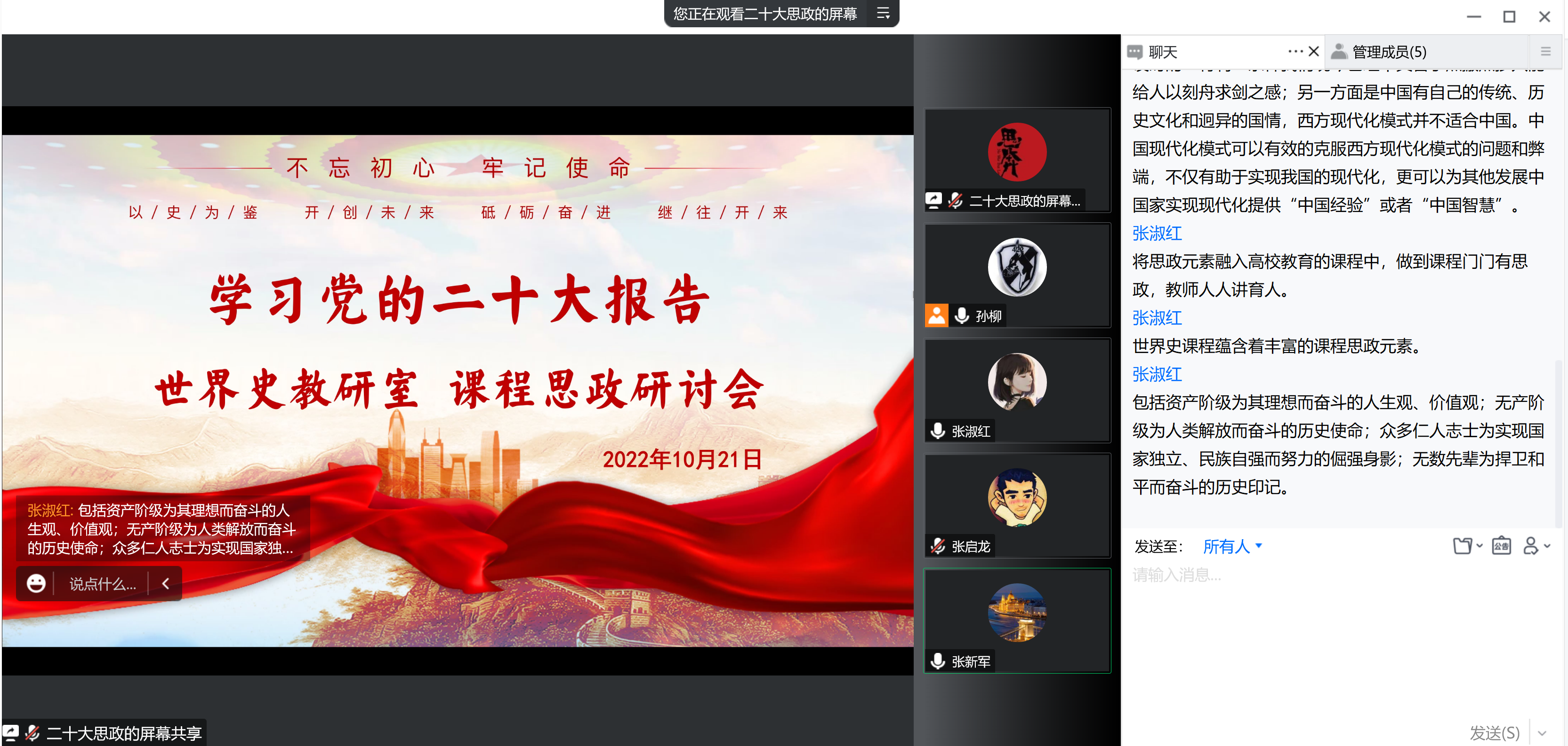 在中国共产党第二十次全国代表大会召开之际,永利3044noc历史系世界史教研室于10月21日上午进行“党的二十大报告与世界史课程思政”专题研讨会,教研室教师就党的二十大报告内容、精髓与世界史课程思政之间的关系在腾讯会议进行了深入探讨。