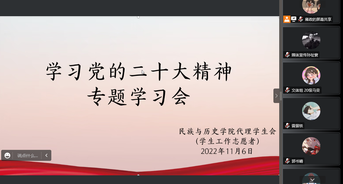 同学们积极分享了自身关于党的二十大召开的感想与体悟:胡杨名回顾了党十年来的彪炳史册的成就,并以“为有牺牲多壮志,敢教日月换新天”这句诗说明党始终坚持初心使命和革命精神。杨昕则从社会主义发展史的角度,回顾了党的创造性成就,她提到:“一代人有一代人的长征,一代有一代人的使命,我们这一代青年应当扛起时代使命,为建设祖国继续奋斗。”