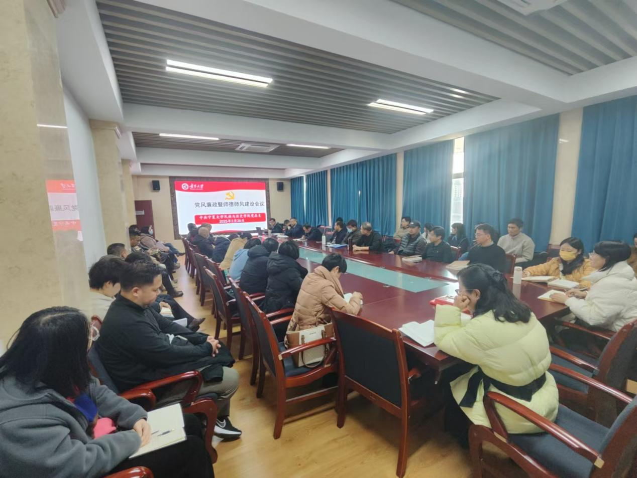 2025年2月26日,永利3044noc召开全面从严治党、党风廉政建设暨师德师风建设工作会议,深入学习贯彻中央和自治区关于全面从严治党最新要求,全面部署学院年度党风廉政与师德师风建设工作。会议由学院党总支书记刘杰主持,学院领导班子、全体党员及教职工参会。