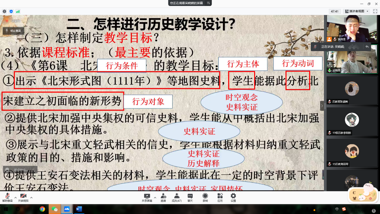 随后,那如何进行历史教学设计,吴老师根据自己的备课流程,为同学们进行了详细的讲解,教学设计要做到环环紧扣,体现整个过程的层次性和完整性。注重分析教材和学情,老师强调要关注教材的版本和变化,使用最新的教材,分析教材的内容和知识结构,并且要站在整体的角度分析每一课;另外,要考虑学生的接受水平,确保不同层次的学生在课堂上都要有所收获,对于教学一定要做到有的放矢。更重要的是,老师强调对教学目标的制定,今年是尤为特殊的一年,新课标的实施,由三维目标向核心素养的转变,这就要求同学们在新课标的背景之下,完善教学过程的每一个步骤。明确重难点,学会预判难点,突破重点。老师强调在教学中处于重头戏的则是教学过程,这也是体现教师水平的一个环节,教学过程的变化性、创造性和灵活性很强,每一个环节都需要经过精心的设计和打磨,并且要其注重完整性和趣味性。