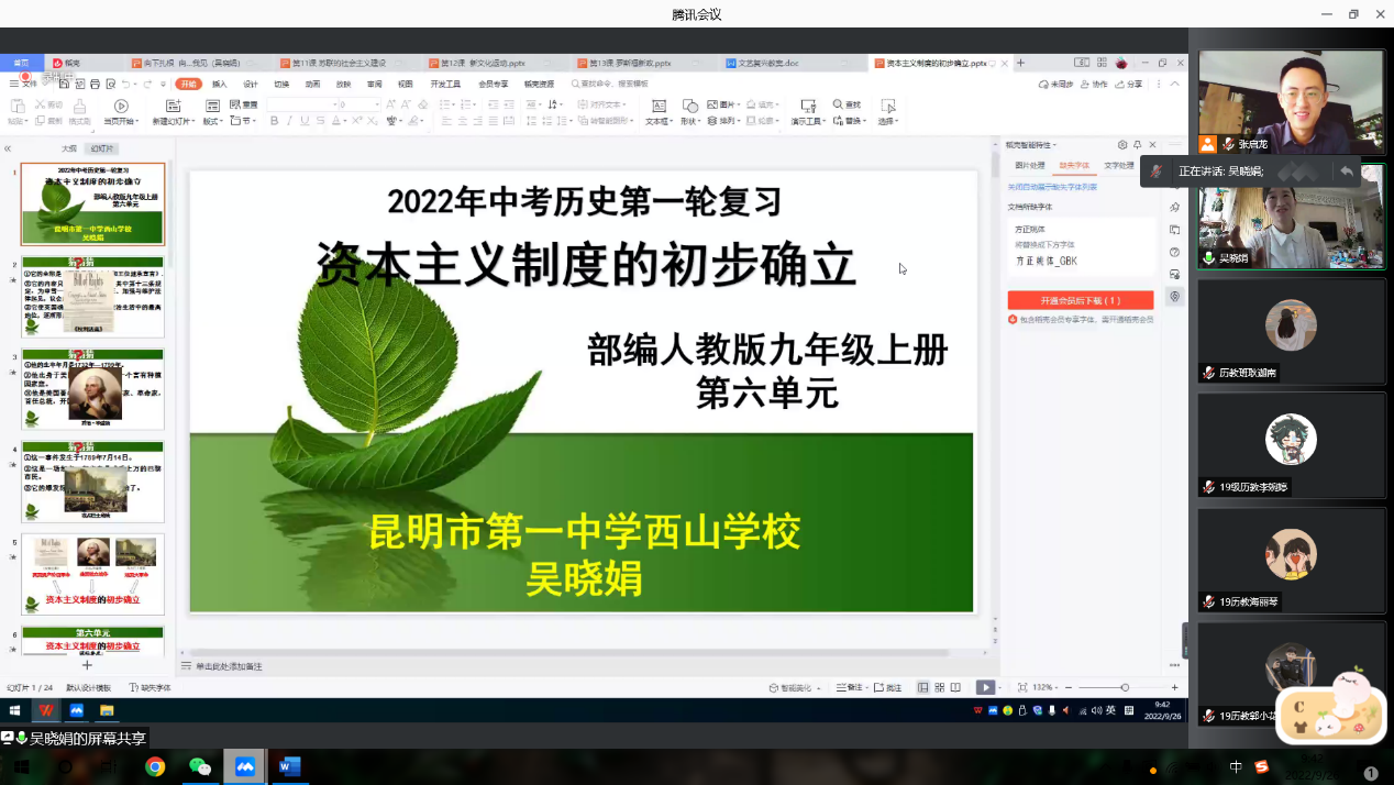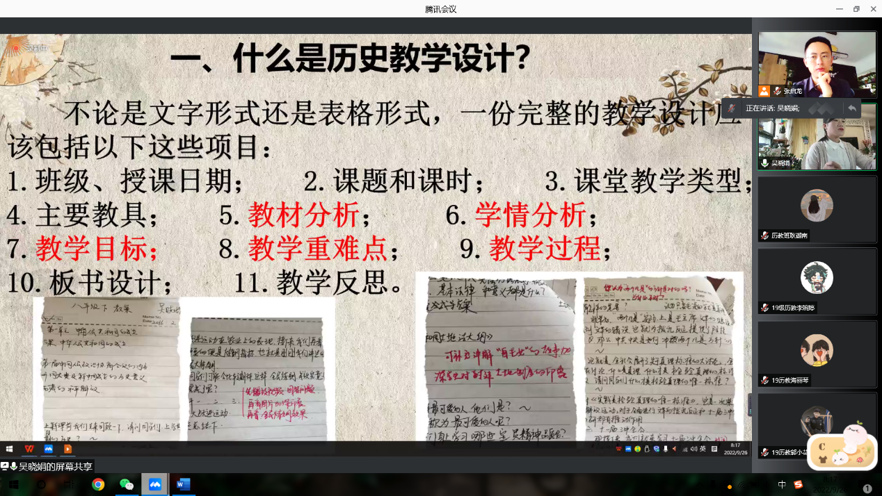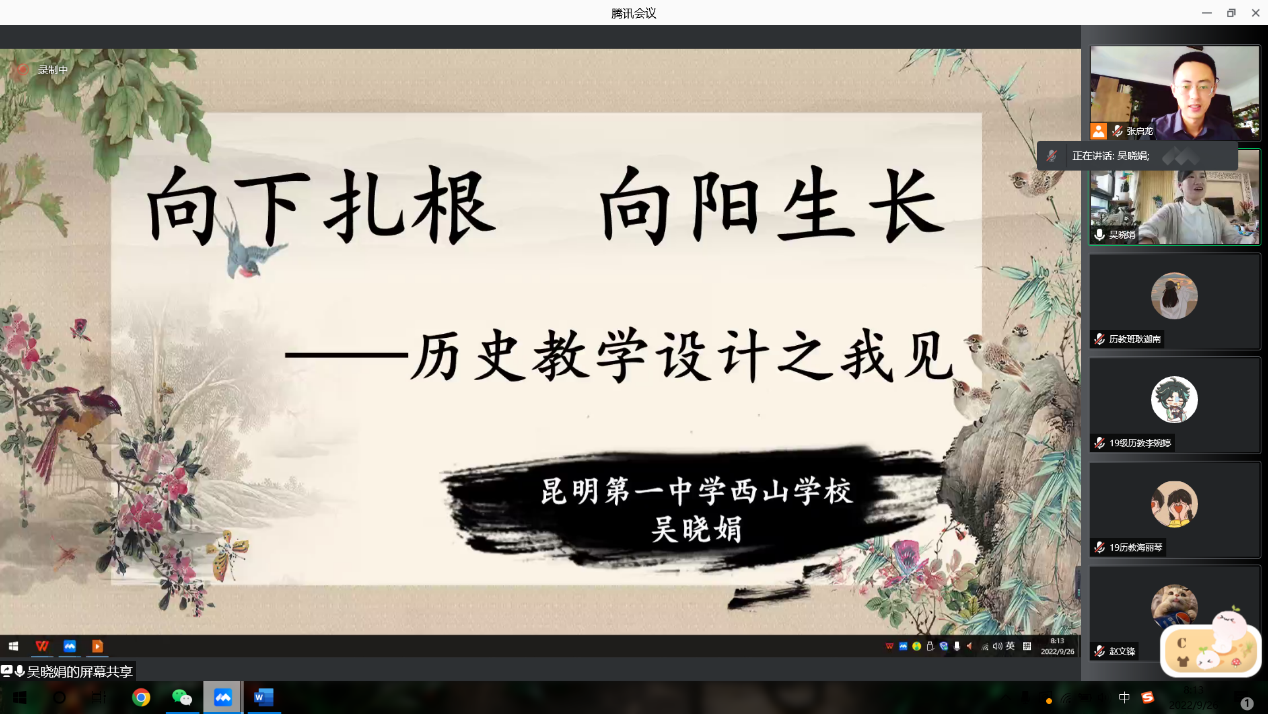 为了推动历史师范专业认证的深入开展,提高学院师范教育的水平与质量,促进大中学师范教育一体化建设,永利3044noc于2022年9月26日上午进行了“历史名师面对面”系列讲座第五讲。部分历史学(师范)本科生和学科教学(历史)全体研究生,参与了线上腾讯讲座。本次讲座邀请了云南昆明第一中学西山学校教学名师吴晓娟主讲,主题为“向下扎根,向阳生长——历史教学设计之我见”,活动由历史系副主任张启龙老师主持。