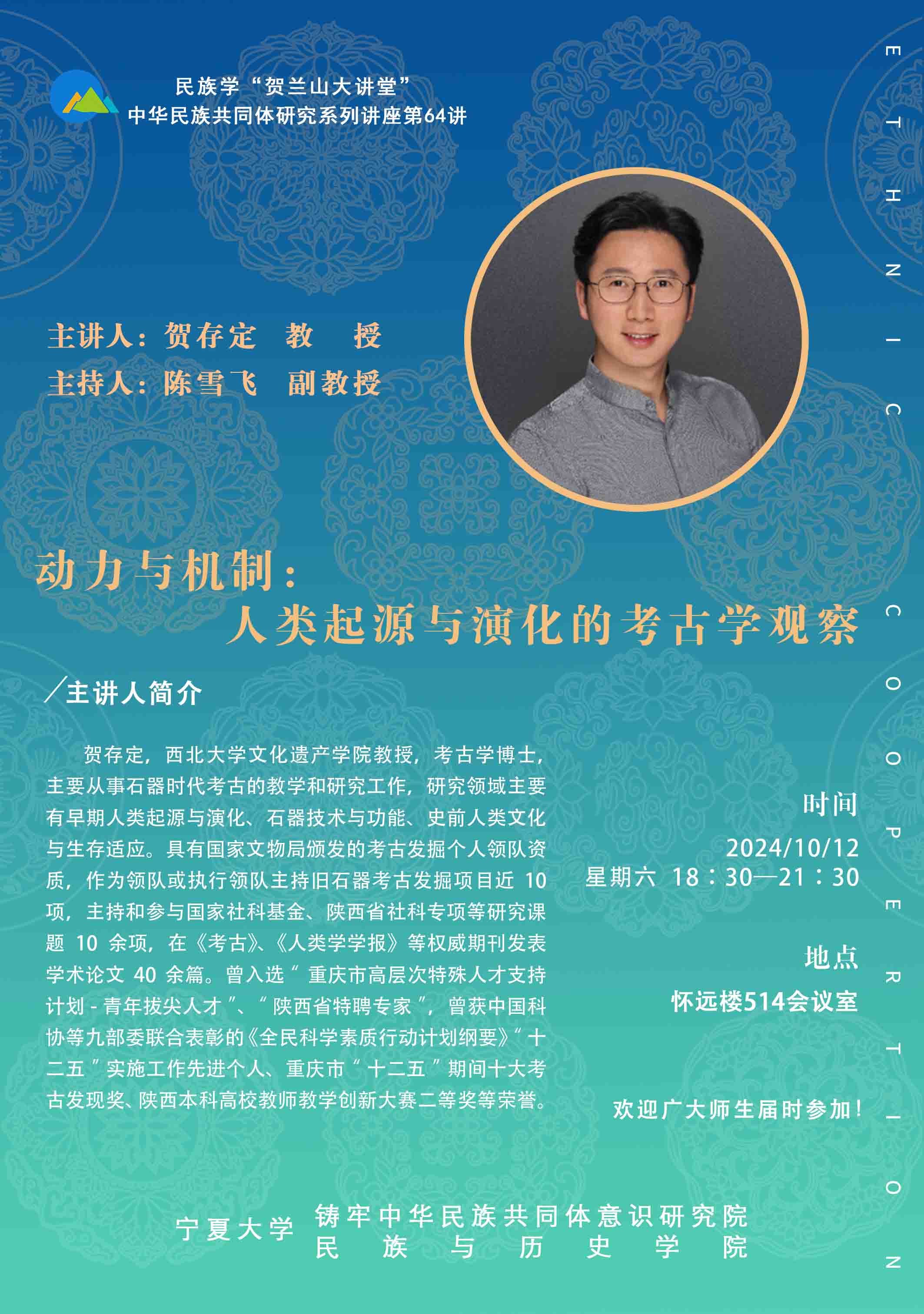 报告人简介:贺存定,西北大学文化遗产学院教授,考古学博士,主要从事石器时代考古的教学和研究工作,研究领域主要有早期人类起源与演化、石器技术与功能、史前人类文化与生存适应。具有国家文物局颁发的考古发掘个人领队资质,作为领队或执行领队主持旧石器考古发掘项目近10项,主持和参与国家社科基金、陕西省社科专项等研究课题10余项,在《考古》、《人类学学报》等权威期刊发表学术论文40余篇。曾入选 “重庆市高层次特殊人才支持计划-青年拔尖人才”、“陕西省特聘专家”,曾获中国科协等九部委联合表彰的《全民科学素质行动计划纲要》“十二五”实施工作先进个人、重庆市“十二五”期间十大考古发现奖、陕西本科高校教师教学创新大赛二等奖等荣誉。