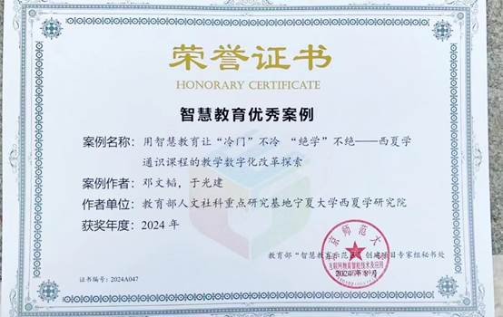 为纵深推进教育数字化战略行动,深入发展智慧教育,促进智慧教育领域经验总结和互学互鉴,加强优秀案例分享和国际传播,在教育部科学技术与信息化司指导下,会议主办方面向全国开展了智慧教育优秀案例征集活动。由我院教师邓文韬、于光建编纂,3044AM永利集团本科生院报送的《以智慧教育让“冷门”不能“绝学”不绝——西夏学通识课程的教学数字化改革探索》成功入选本年度智慧教育优秀案例。